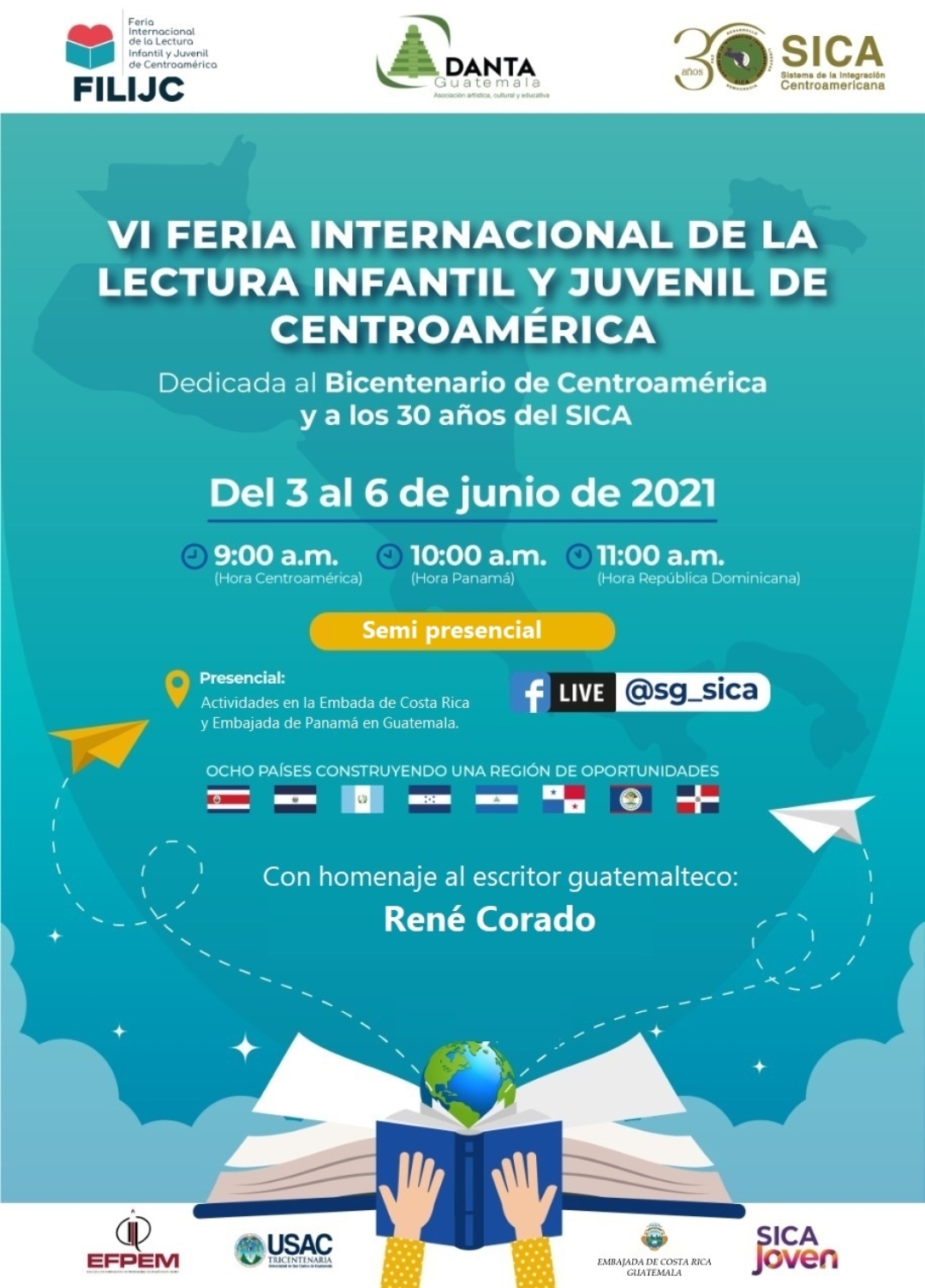 Cada año Danta Guatemala dedica la edición de la FILIJC a un destacado escritor o escritora de Centroamérica. Este año, la VI edición le brindará homenaje al escritor guatemalteco René Corado. La feria de la lectura se desarrollará de forma virtual a través de la plataforma SICA Digital del jueves 3 de junio al domingo 6de junio, desde las 9:00 horas hasta 18:00 horas (Horario Guatemala).